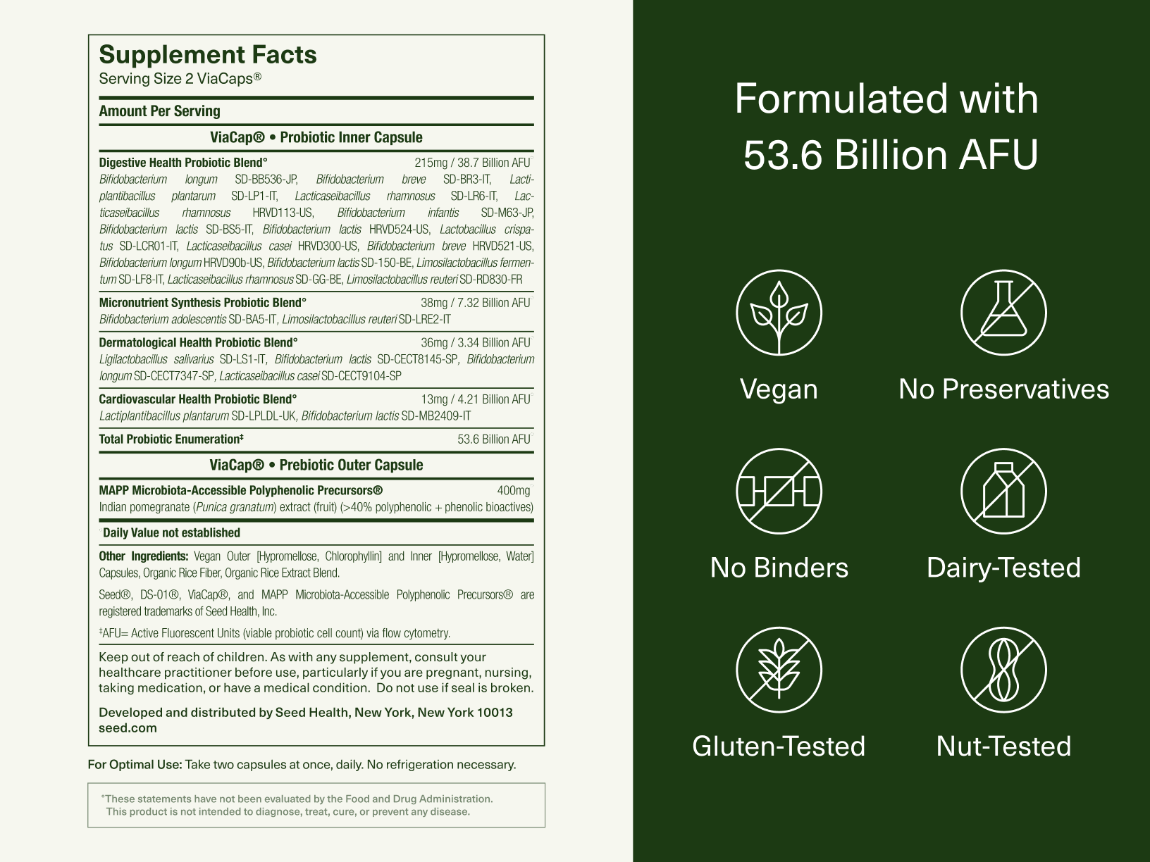 DS-01 is formulated with 24 scientifically and clinically studied probiotic strains and a patented, non-fermenting prebiotic.